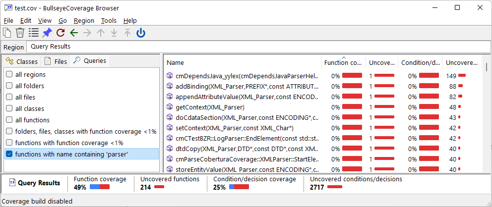 Select a function in the left pane to see coverage measurements at the source code level. |