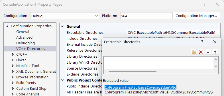 Enabling integration for Visual Studio adds the BullseyeCoverage\bin to the front of the Executable Directories setting.